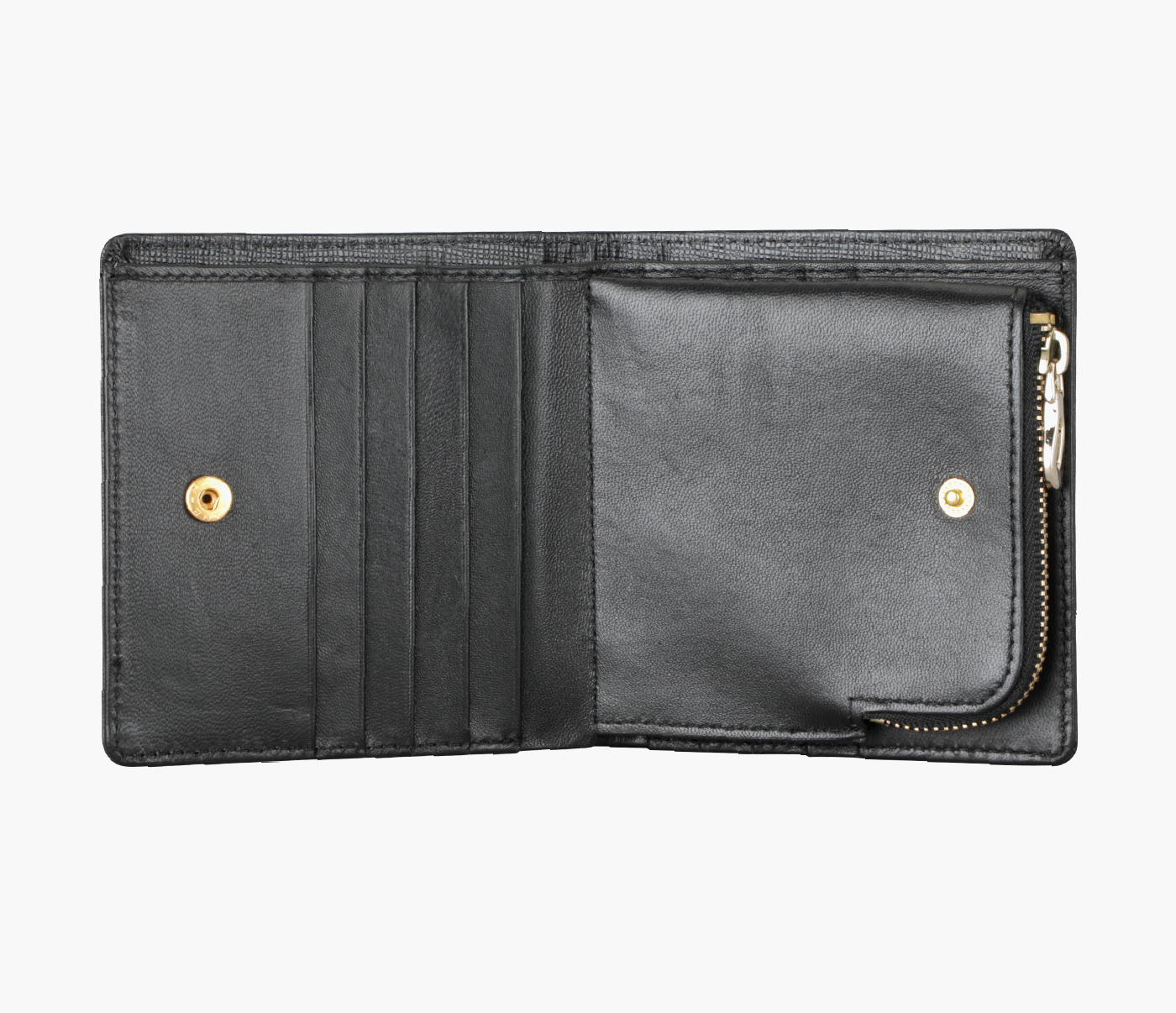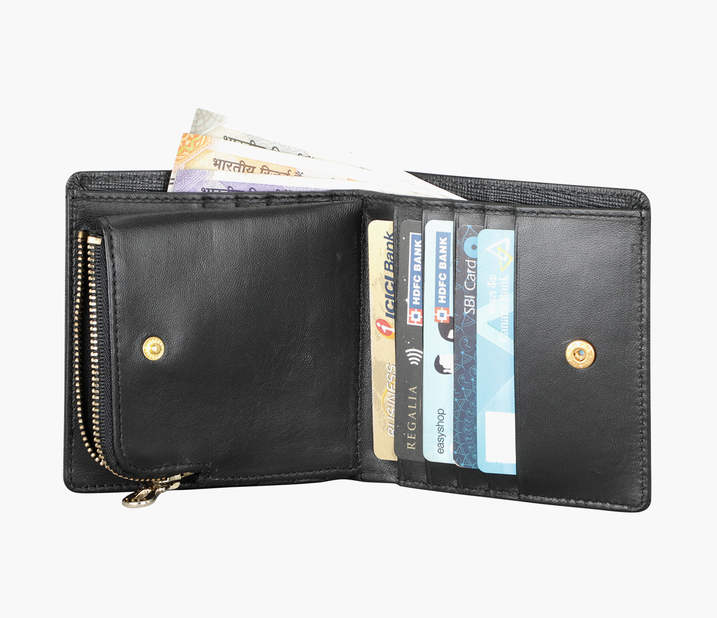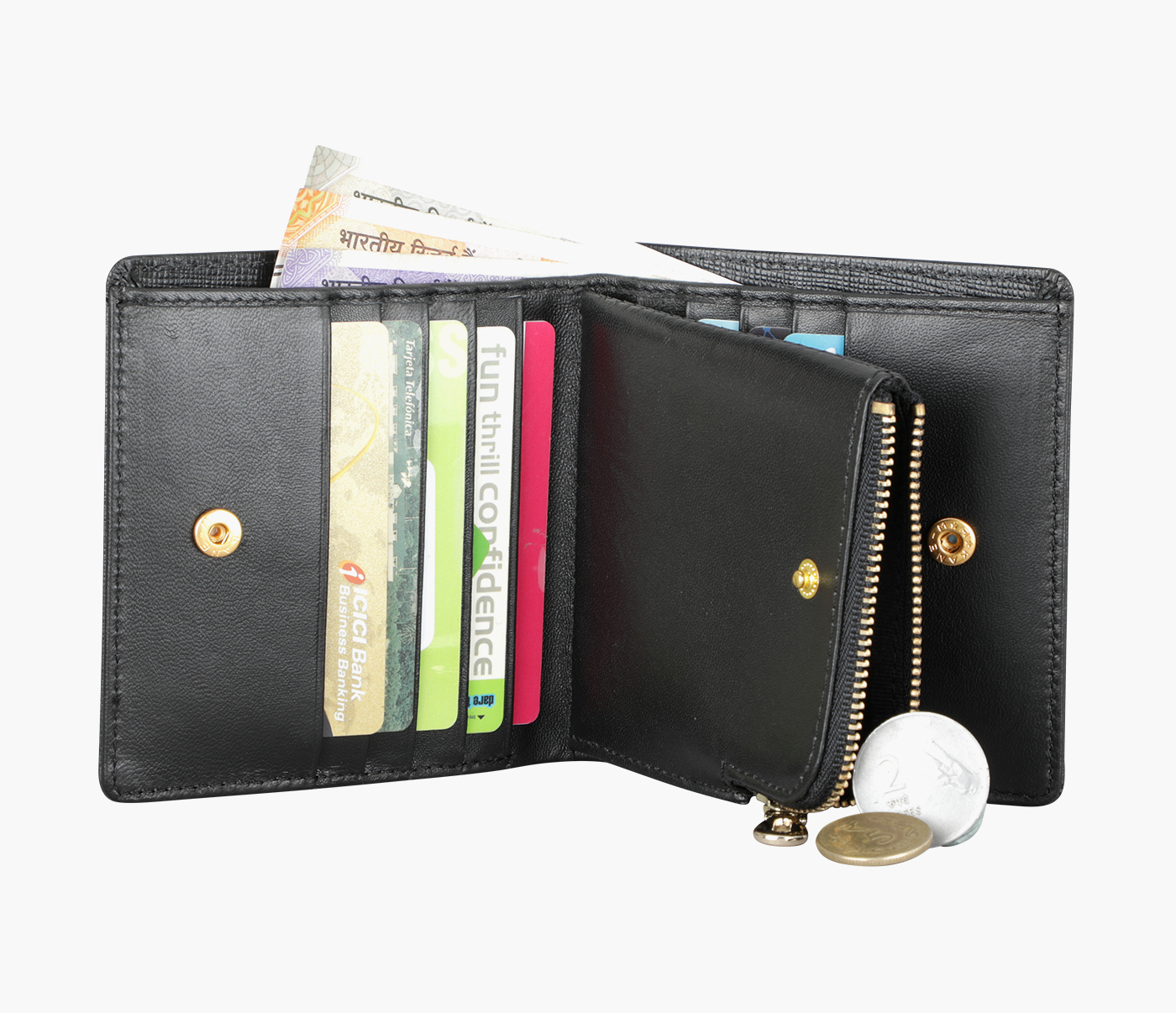- CENTRE METAL ZIP POCKET PARTITION TO HOLD COINS WITH BOTH SIDES PRESS BUTTON CLOSING
